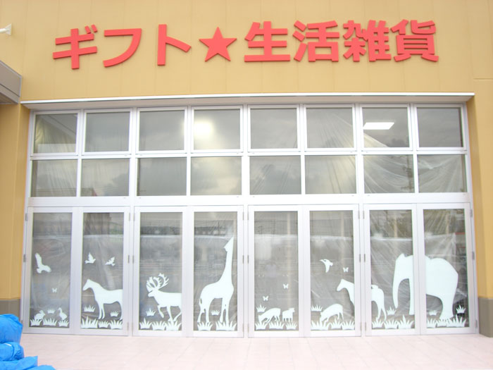 ガラスサッシ面にもいろいろな動物たちがお客様をウェルカム