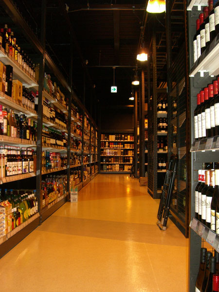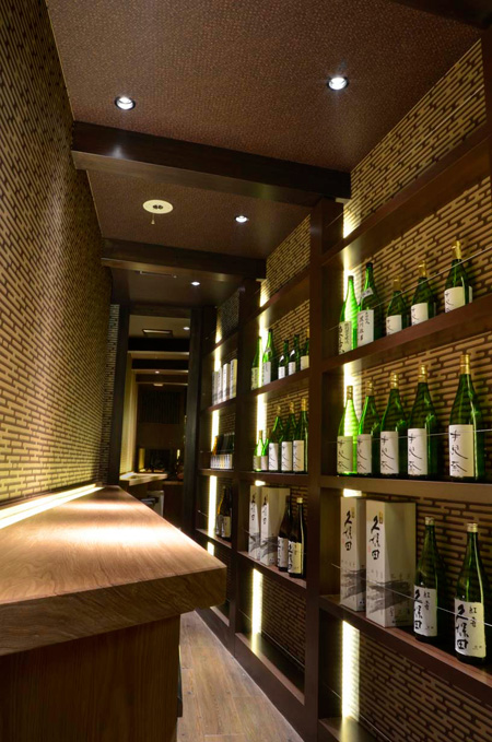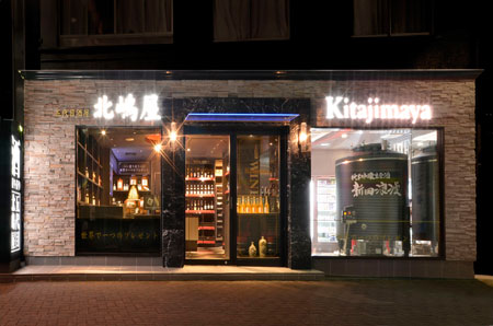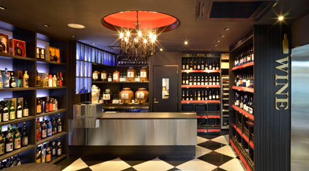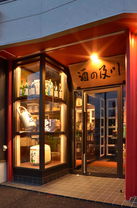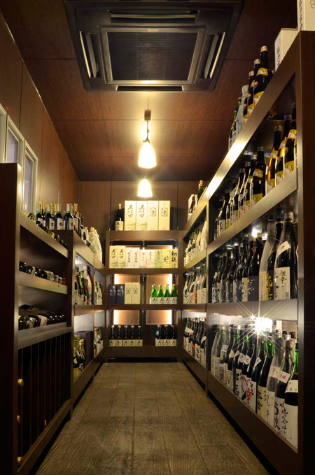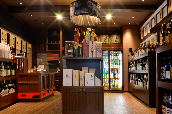 正面日本酒・焼酎コーナー、右量り売り用瓶ディスプレイ