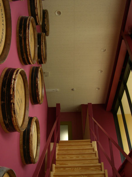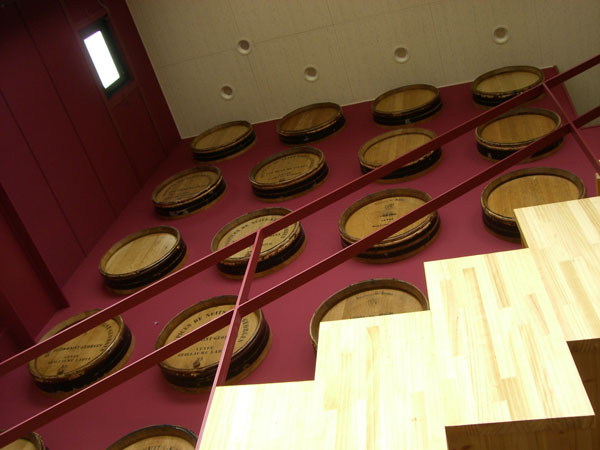 階段室にはワインレッドの壁とワイン樽づらりインパクト絶大!臨場感絶大!
