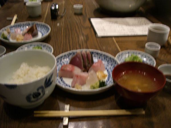 左がかまどの御飯。刺身は新鮮で美味でした。